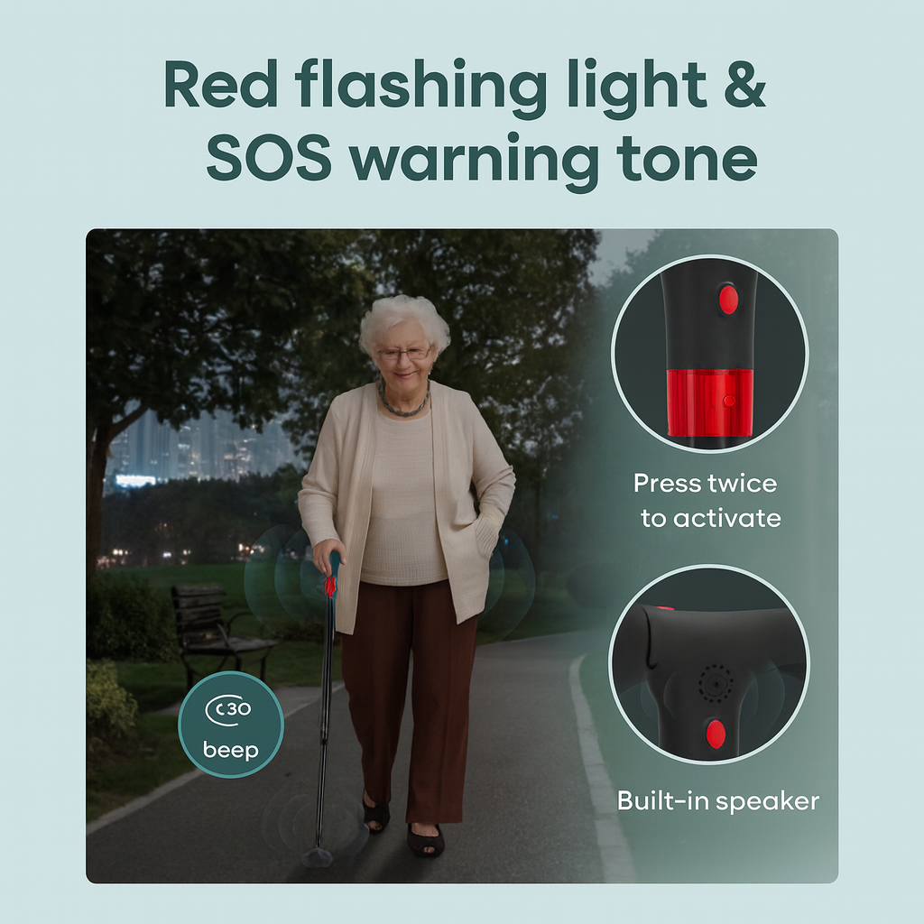 The Mobility Cane goes a step further in ensuring your safety. In the event of a fall or an emergency, the alarm can be easily activated to sound a loud, clear signal, alerting those nearby to help you.